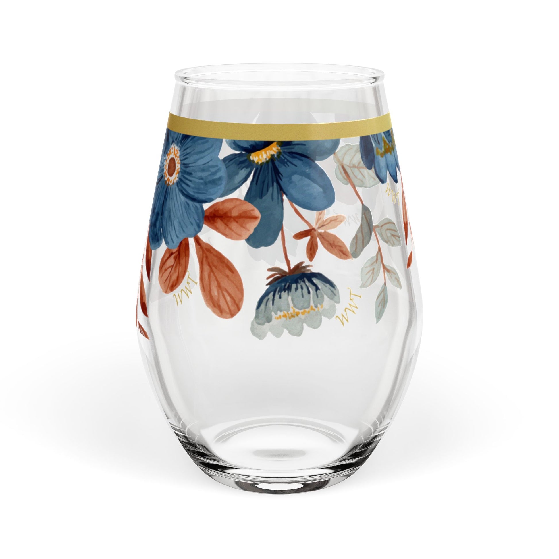 Sip slowly and savor quiet evenings with this elegant stemless wine glass. Hand-painted florals cascade around the rim in soft blues, muted corals, and sage leaves, while a subtle gold band crowns the top—an understated touch that catches the light. The rounded silhouette sits comfortably in your hand and feels at home on a small balcony table, beside an open cookbook in the kitchen, or as part of a relaxed dinner with close friends. It’s for people who love thoughtful details: the color depth of printed florals, glossy highlights that pop against clear glass, and the ritual of hand-washing to keep the design vivid.
